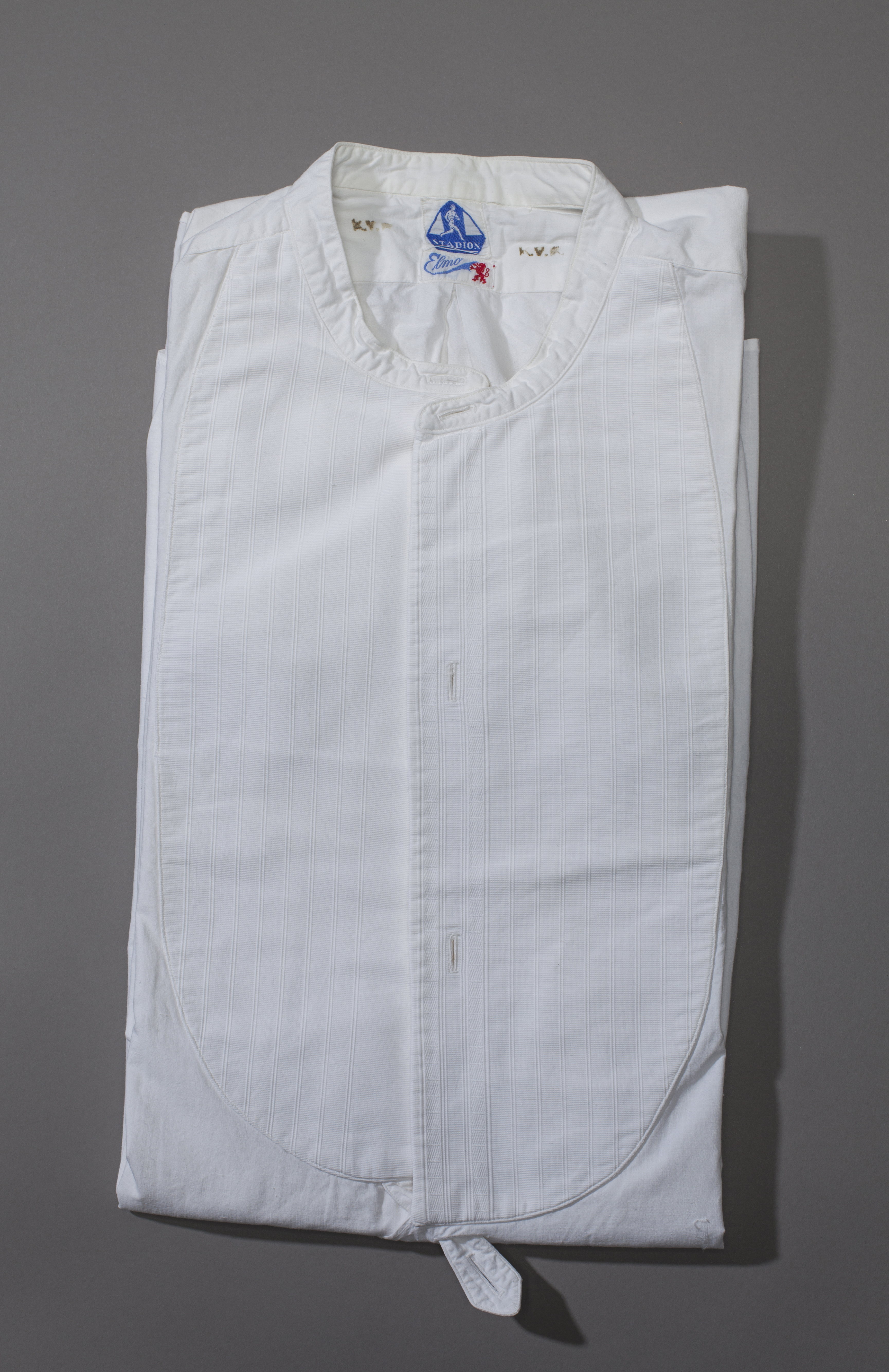 Varsin reiluksi leikattu paita on takaanapitettava. Tärkättyyn etumukseen kiinnitetään irtonapit vain koristustarkoituksessa. Myös kalvosimet ovat tärkätyt.