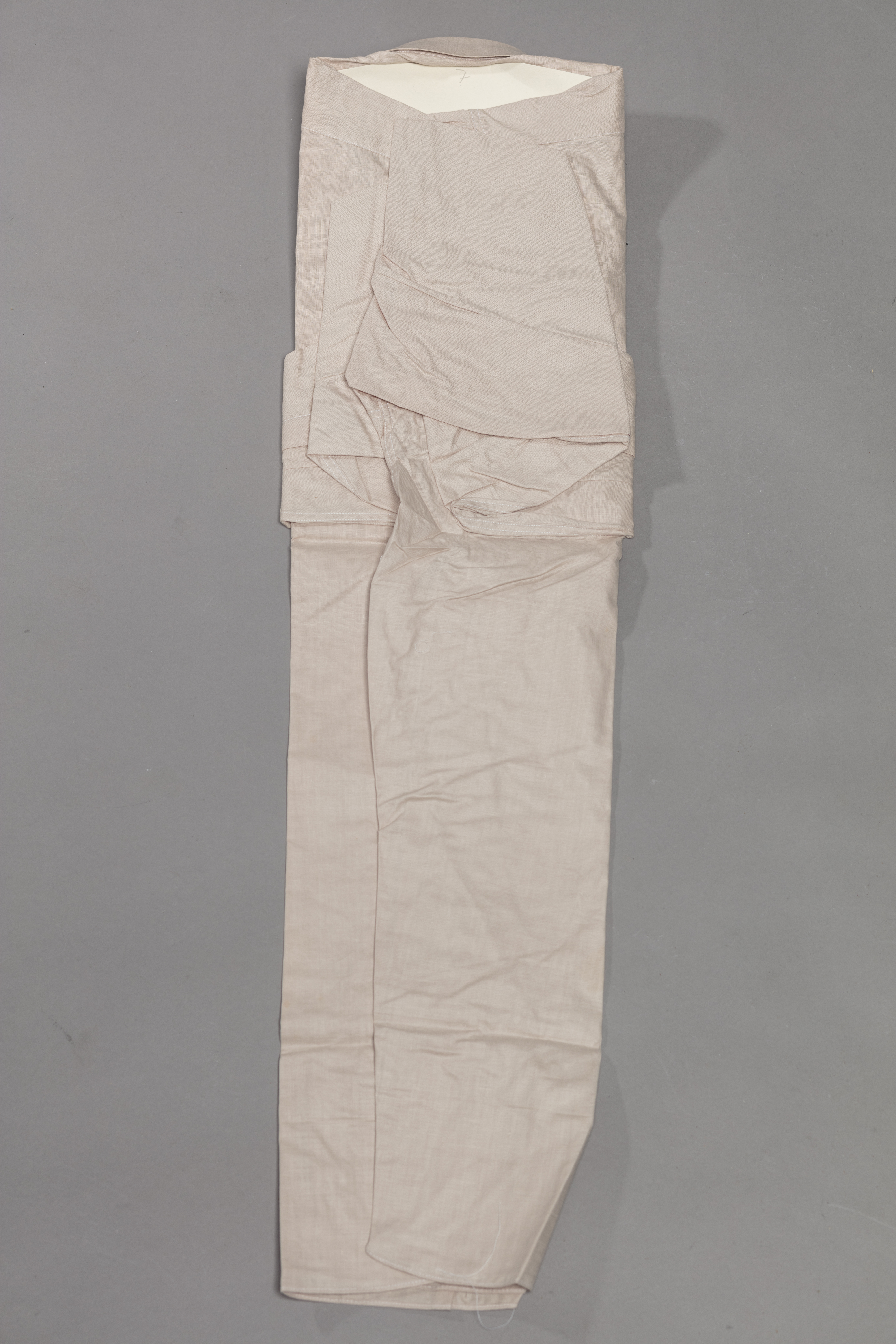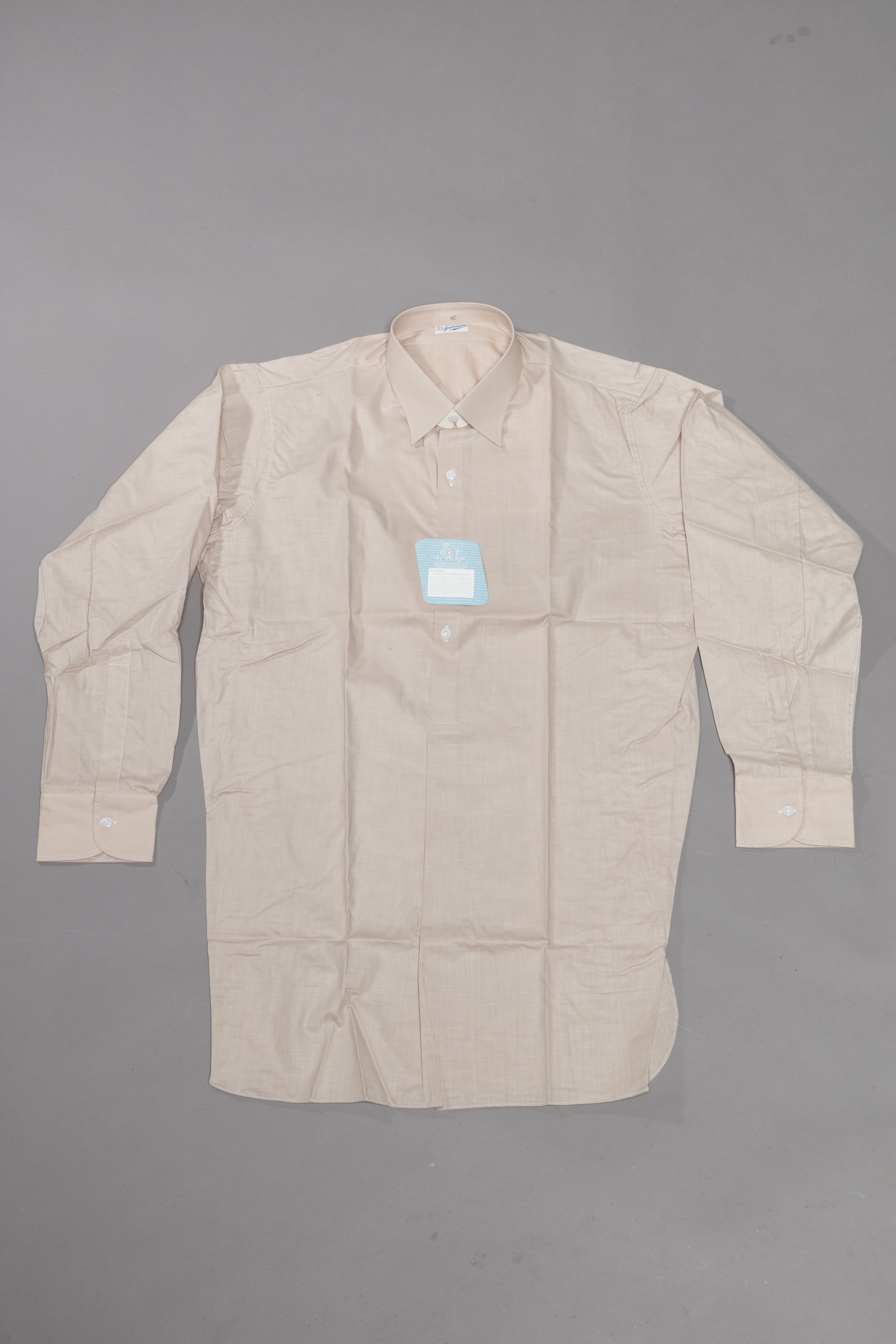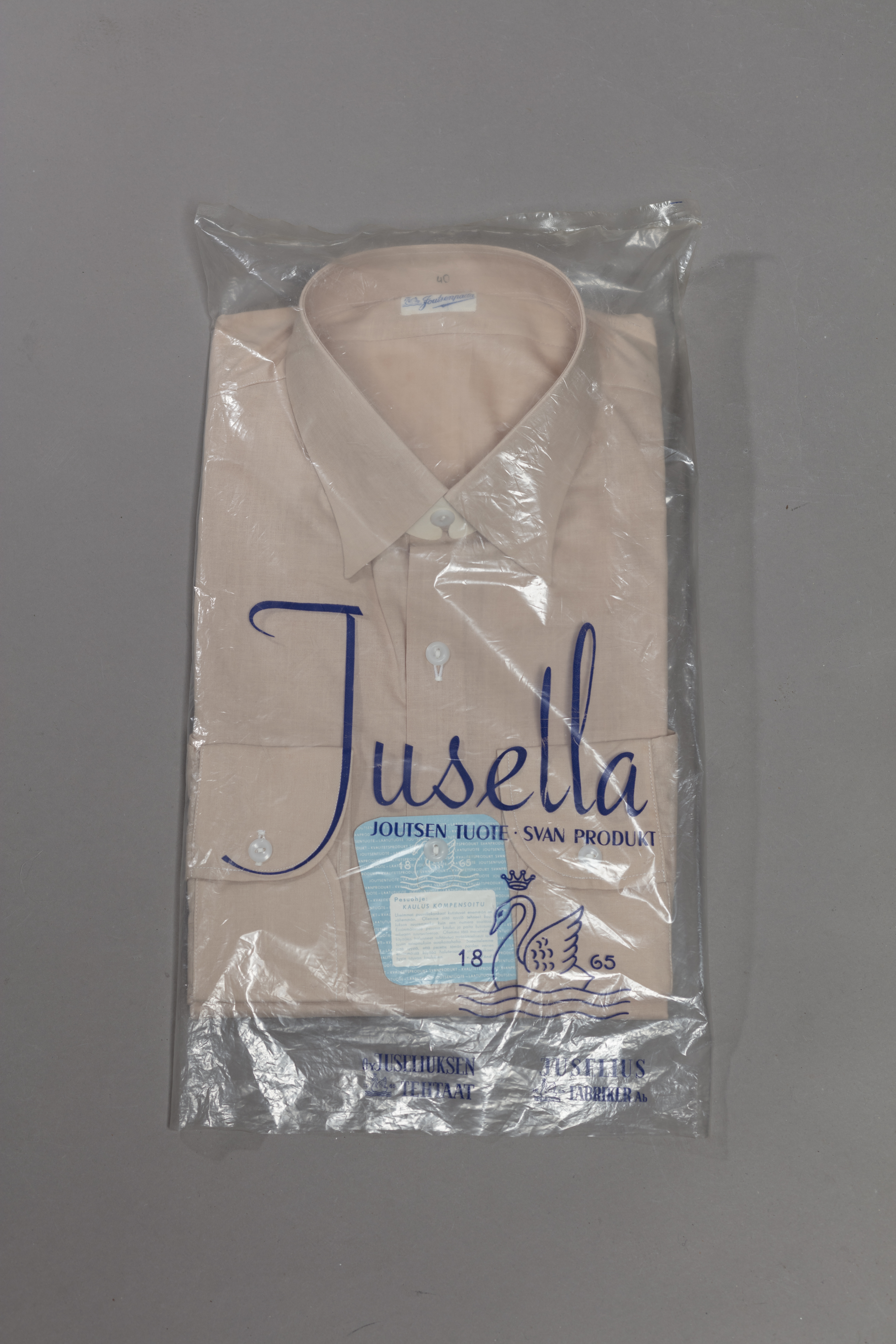Paita on merkitty kangasmerkillä Joutsenpaita. Tämän joutsen-brändäyksen Juseliuksen Paitatehdas O.Y. lanseerasi vuonna 1929, kunnes se siirtyi pääasiassa Jusella-brändiin myös paitatuotteissaan. Mielenkiintoisesti tästä paidasta ja pakkauksesta löytyvät molemmat brändäykset. Tämä saattaa viitata siihen, että paita on valmistettu pian uuteen brändiin siirtymisen jälkeen, jolloin vanhat merkkilaput olisi käytetty loppuun. Kaulus on pakkausta varten vahvistettu pahvisoirolla. Nappiin kiinnitetyssä lapussa on pesuohje, joka kehottaa käyttäjää pesemään paidan ennen käyttöä, sillä kangasta ei ole esikutistettu.