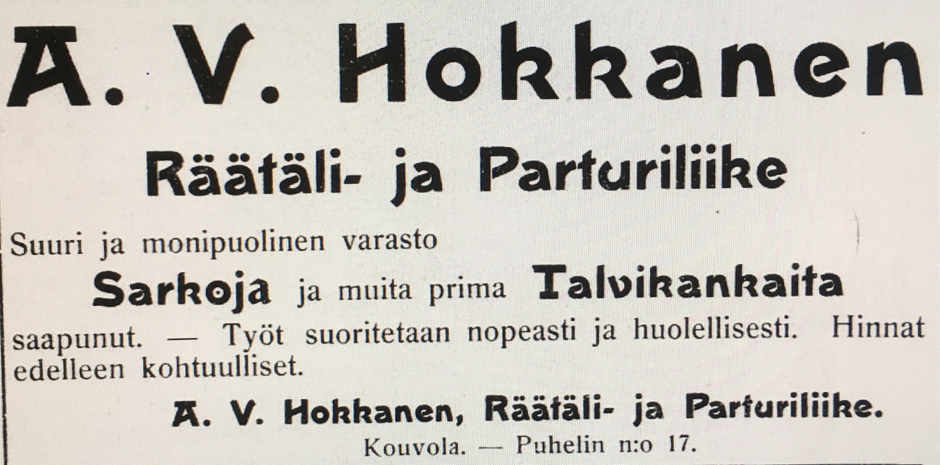 Räätälimestari H. Mäkisen liike joutui vuonna 1908 konkurssiin, jonka valvonnasta uutisoitiin Haminan Sanomissa 28.1.1908. Konkurssihuutokauppa käytiin 13. helmikuuta [9, 10]. Saman vuoden toukokuussa Mäkinen oli perustamassa uutta liikettään, sillä tämä ilmoitti Työmies-lehdessä palkkaavansa räätälin. Tässä mainoksessa tavataan ensi kertaa Mäkisen liikkeellä oma puhelinnumero [11].